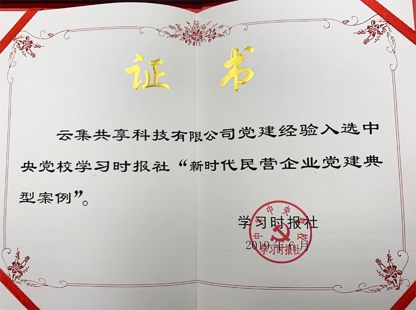 6月22日,在中央党校报刊社(学习时报)举办的全国民营企业党建交流会上,云集“五个党建”模式被评为全国典型案例。云集党委书记、高级副总裁刘友才参加经验交流会,并接受证书。